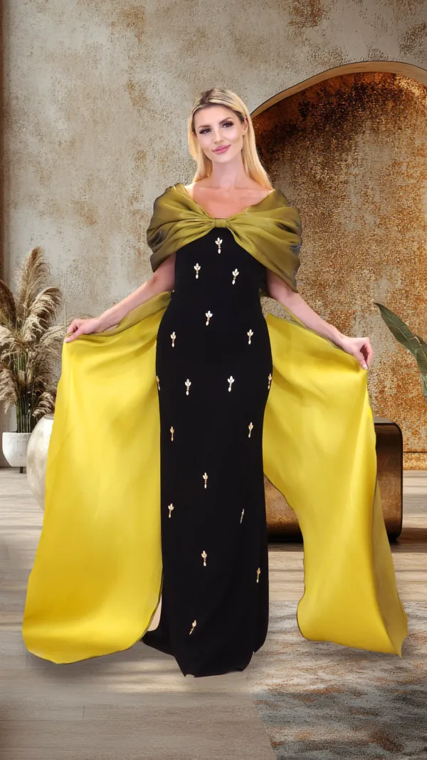 فستان من الكريب بتفاصيل من الأورجانزا على الكتف وذيل في الخلف.