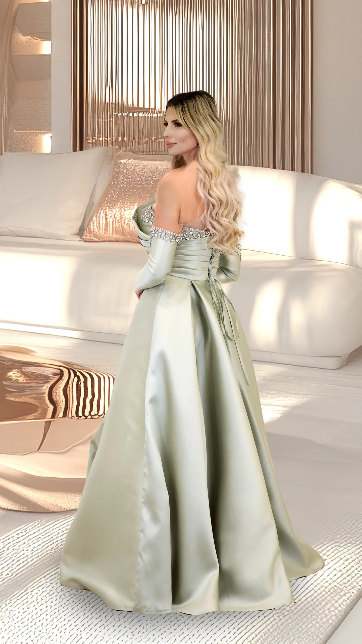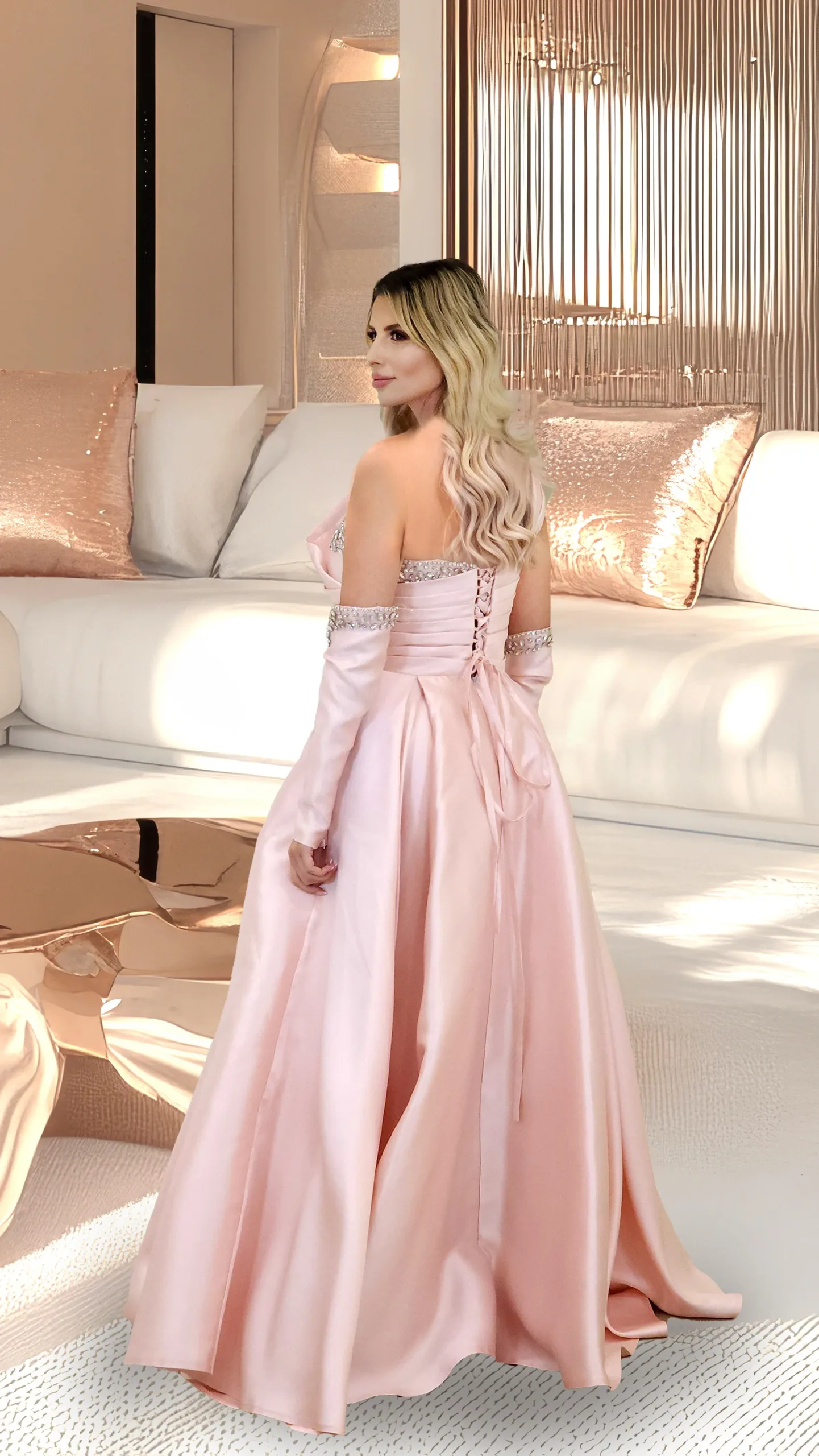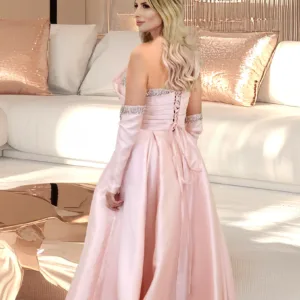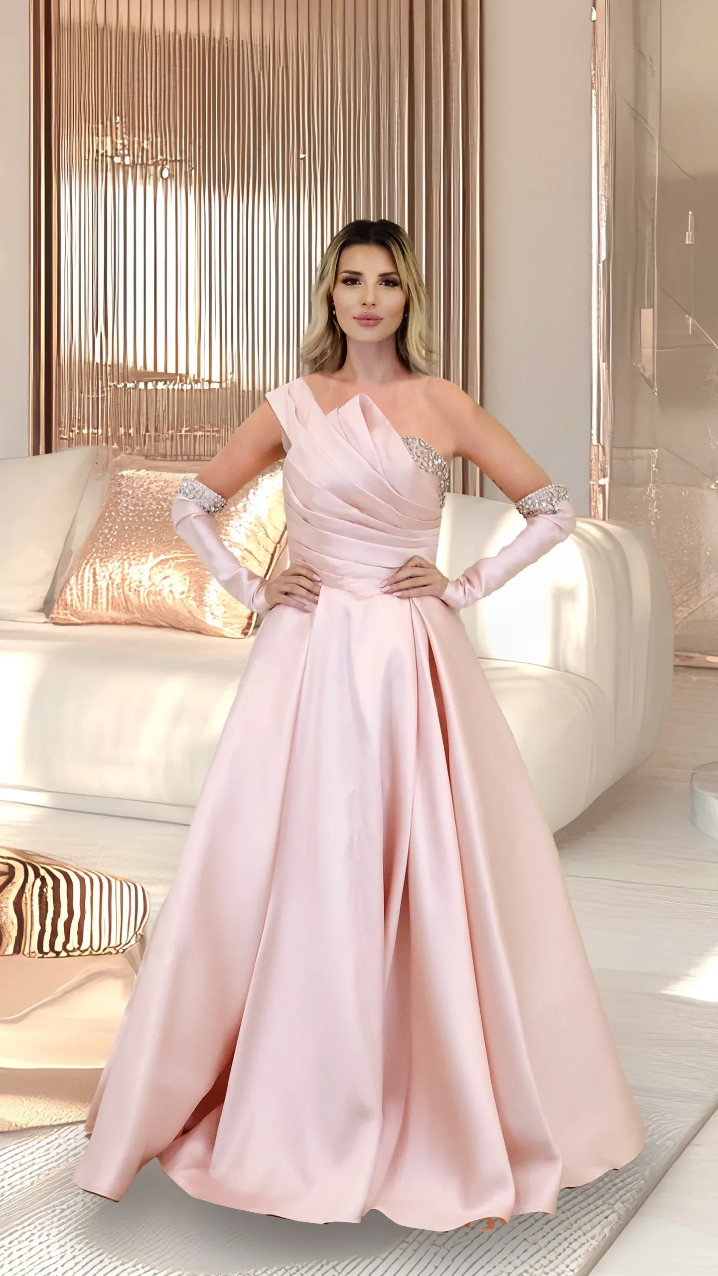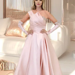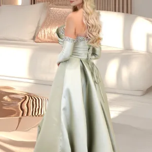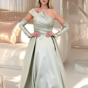 A one-shoulder satin dress with separate sleeves