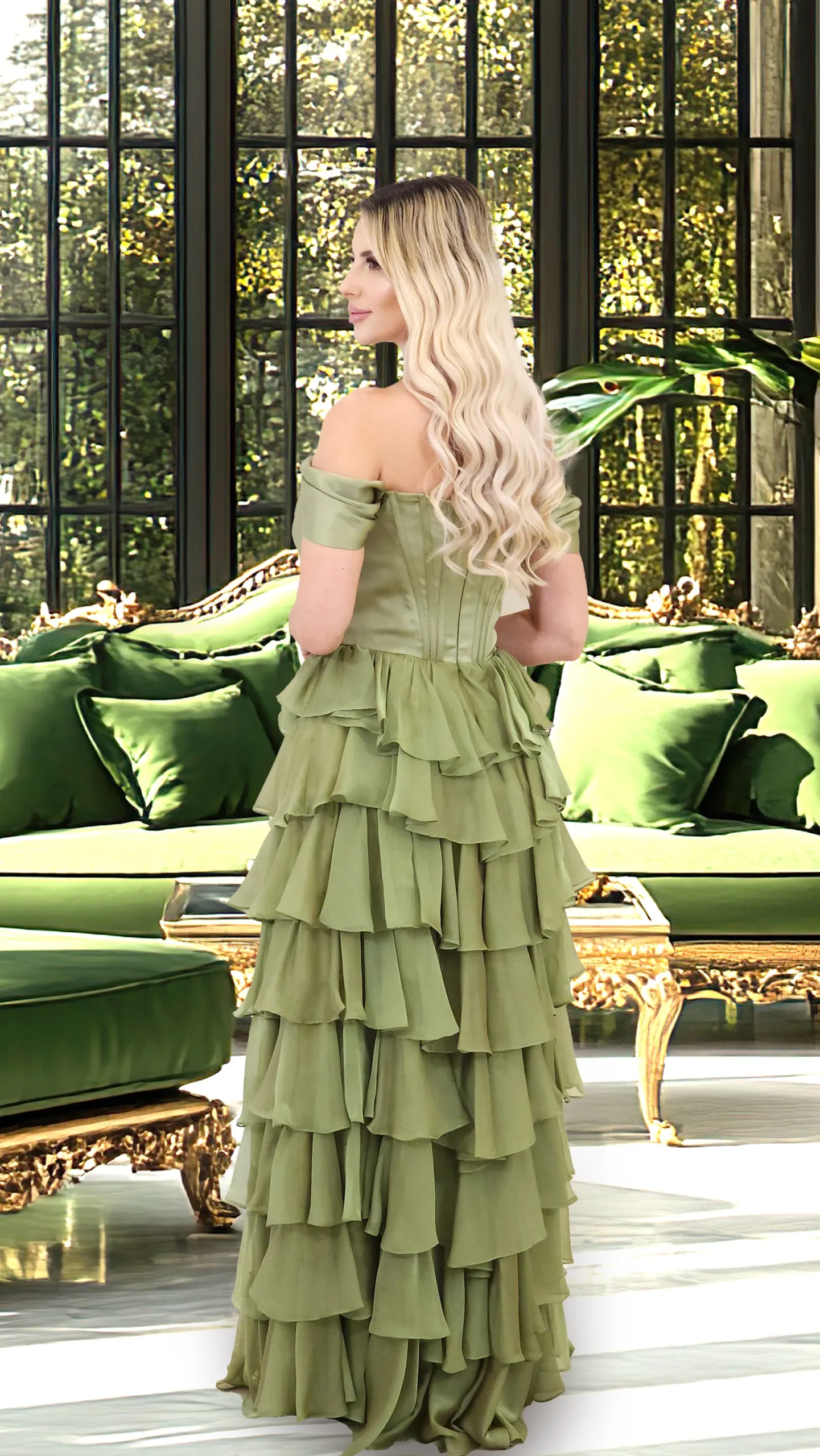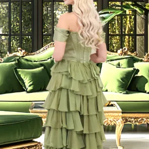 فستان من الساتان مع طبقات رائعة على التنورة وتفاصيل الكتف مع خرز على الصدر.