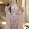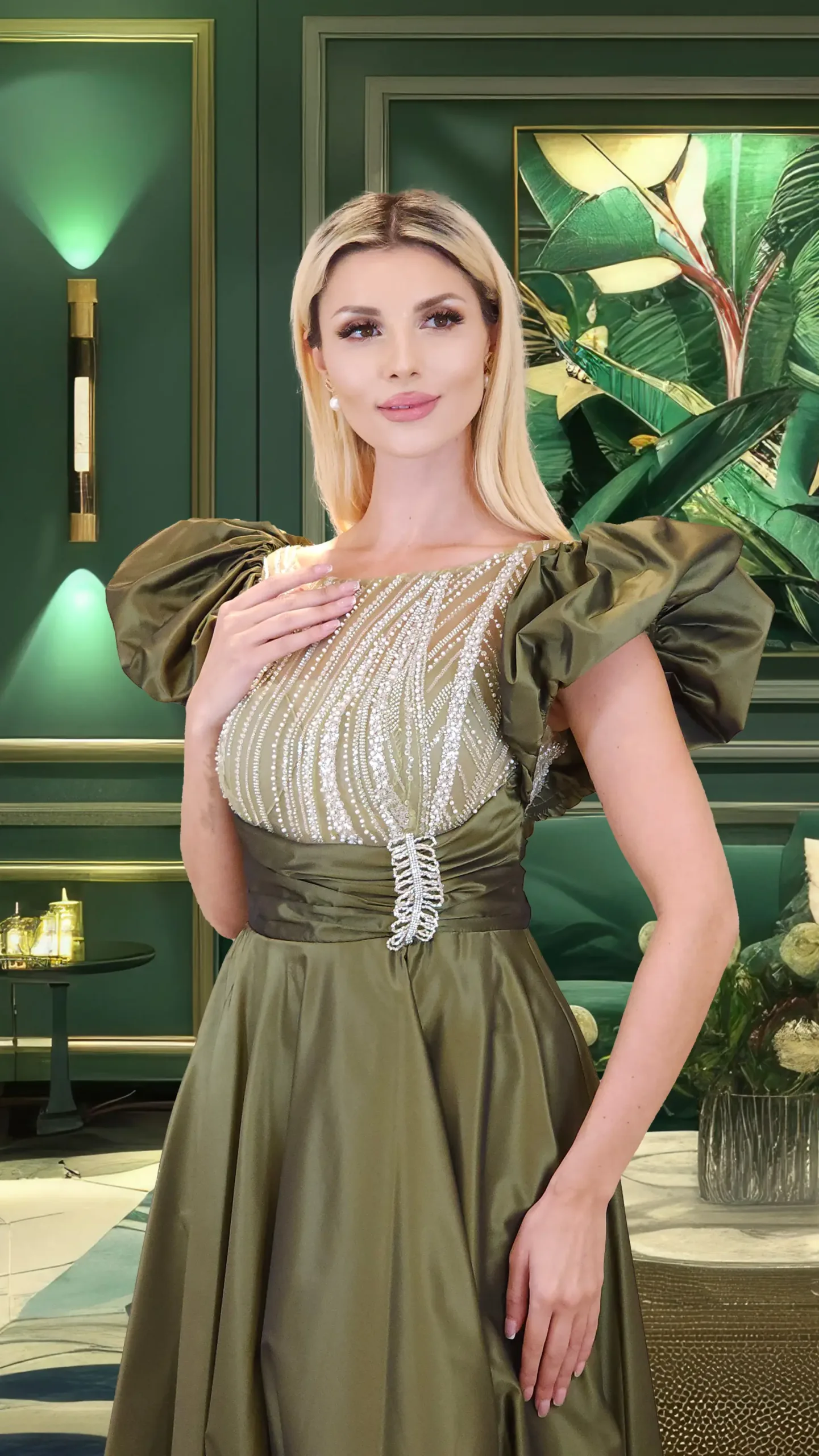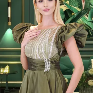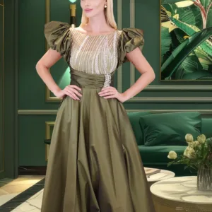 فستان من التافتا مزين بالخرز وأكمام ثلاثة أرباع