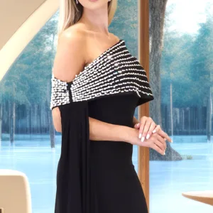Crepe dress with wide shoulders and vertical beading