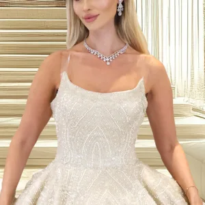 A beige engagement dress with full beading fabric and a layered flared skirt.