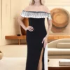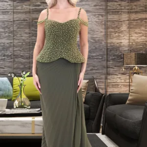 A dress made of pleated chiffon and a blouse embroidered with pearls.