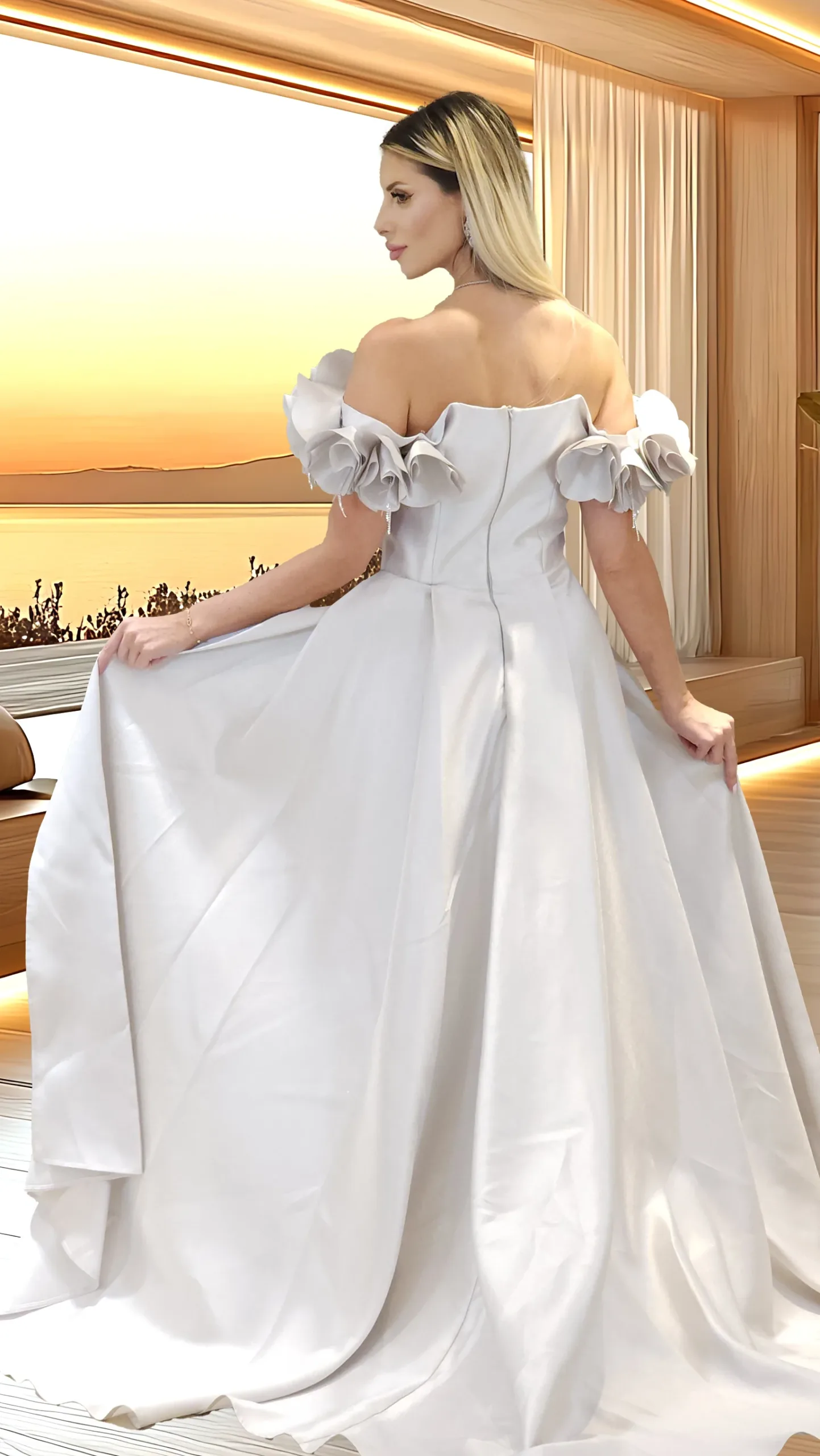Plain satin dress with a hanging extension and raised roses on the shoulders.