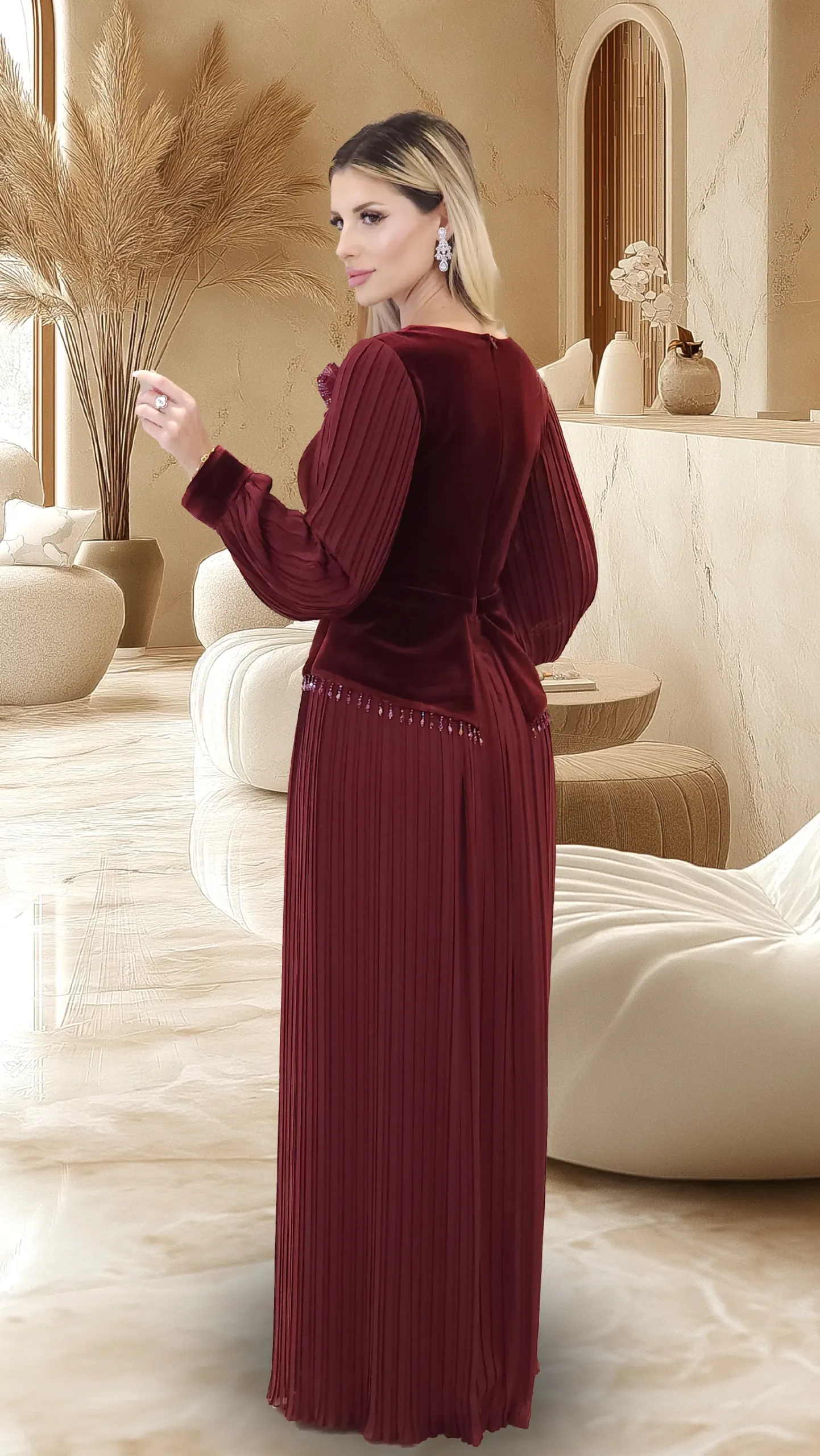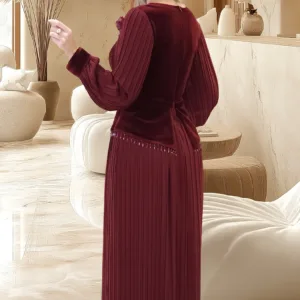 Velvet dress with a pleated skirt and pleated sleeves