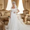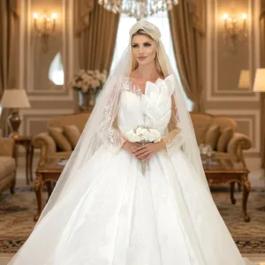 A white wedding dress with a cutout at the chest, a flared skirt, and a long veil.